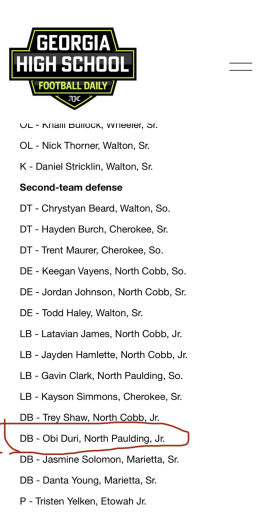 As he enters his senior campaign, Duru projects as the centerpiece of North Paulding’s defensive backfield and a proven playmaker within the region.