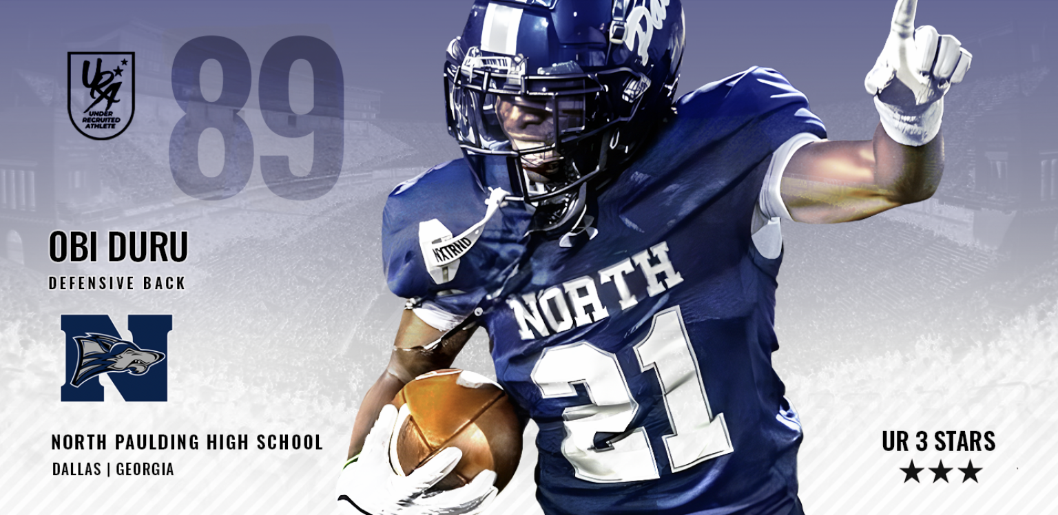 Obi Duru is a defensive back from Dallas, Georgia, the son of Trisha and Joseph Duru, and the brother of two sisters, Nnenna and Chizara Duru. A cornerback at North Paulding High School, Duru has earned All-Conference and All-County recognition while maintaining a solid GPA and strong academic standing.