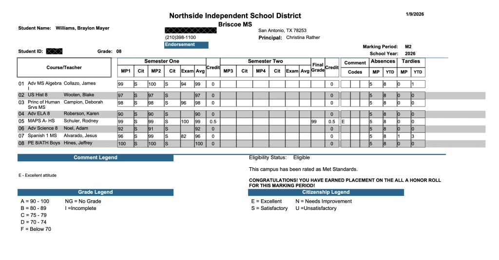 During his 8th grade season, Braylon Williams established himself as a true all-around playmaker, contributing in all three phases of the game as a starting wide receiver, inside linebacker, kick returner, and punt returner. He led his team in tackles while totaling 8 touchdowns, including a pick-six and a punt return for a touchdown. His versatility and impact made him a focal point of the offense, as coaches consistently found ways to get the ball in his hands. Braylon’s contributions played a key role in leading his team to an undefeated season and an NISD 8th grade championship.