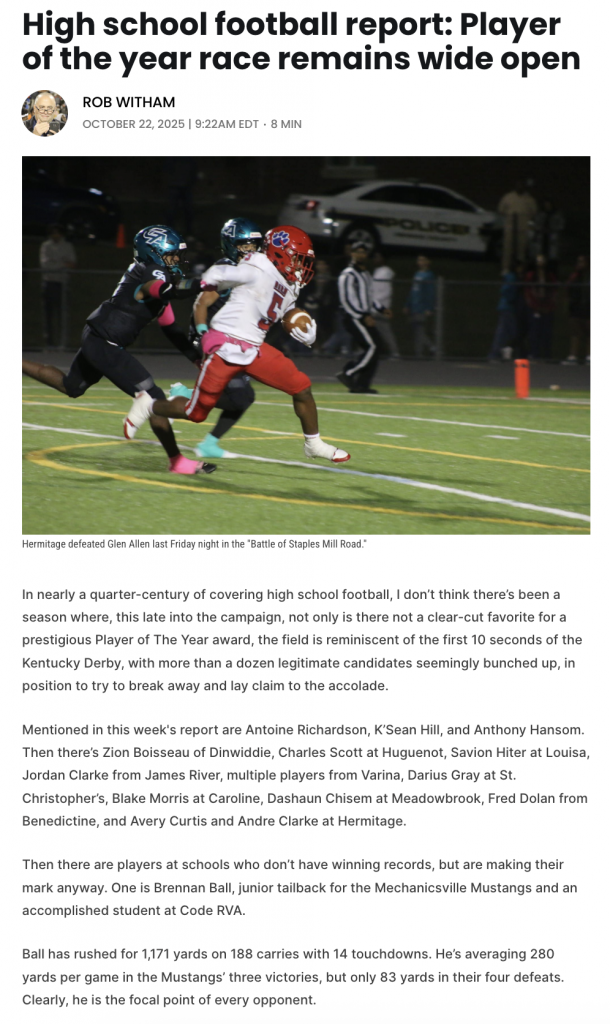 Richmond-area coverage and team leaderboards further support his impact, as he led Mechanicsville in rushing yards per game and touchdowns, establishing himself as a focal point of the offense.