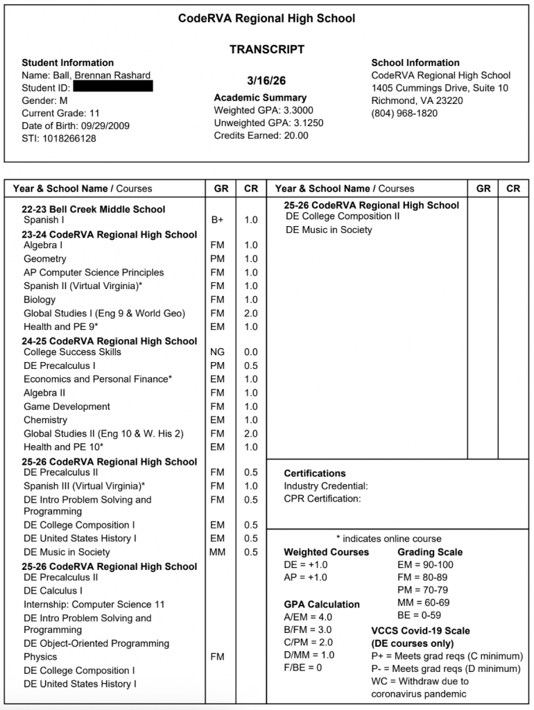 In addition to his academic performance, he has earned multiple character awards throughout his time at CodeRVA. Notably, at the end of his sophomore year, he was recognized for receiving the most character awards in his class, highlighting his leadership, integrity, and positive impact within the school community.