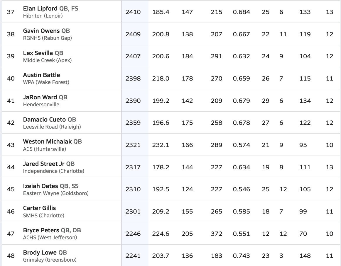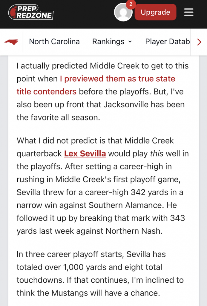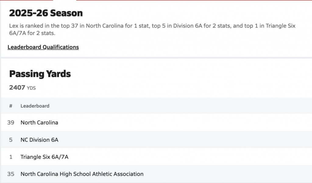 In the 2025 season, Lex Sevilla emerged as one of the top-performing quarterbacks in North Carolina, anchoring a potent Middle Creek High School offense with precision passing and dynamic playmaking. Sevilla finished the year with approximately 2,407 passing yards, 24 passing touchdowns, and a 103.8 quarterback rating, completing over 60% of his attempts across 12 varsity games. He also contributed on the ground with 79 carries for 347 rushing yards and added 2 rushing touchdowns, showcasing his dual-threat ability and toughness as a field general. His total offensive production topped 2,750 yards, ranking him among the leading quarterbacks in the Triangle Six 6A/7A region.