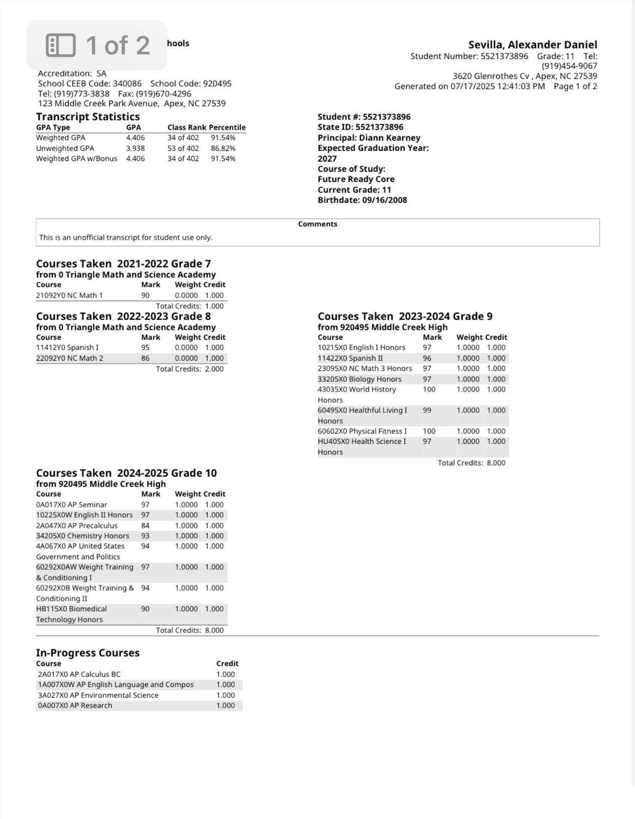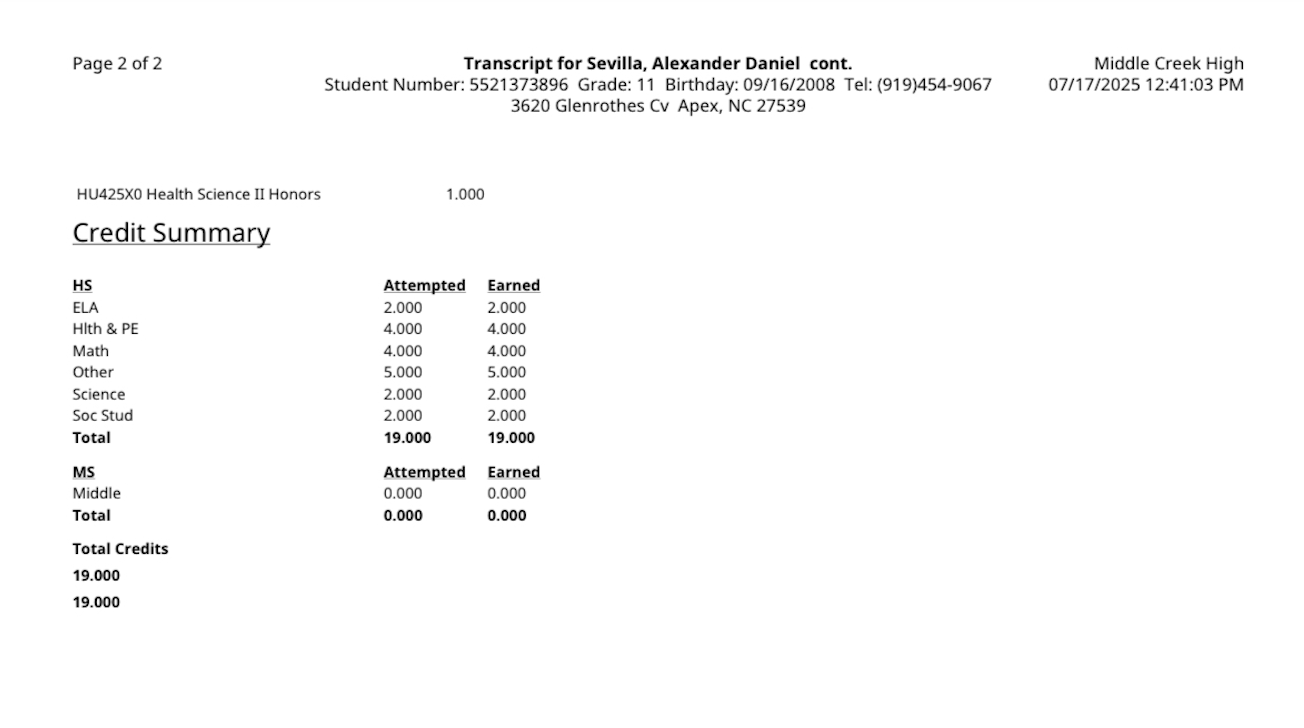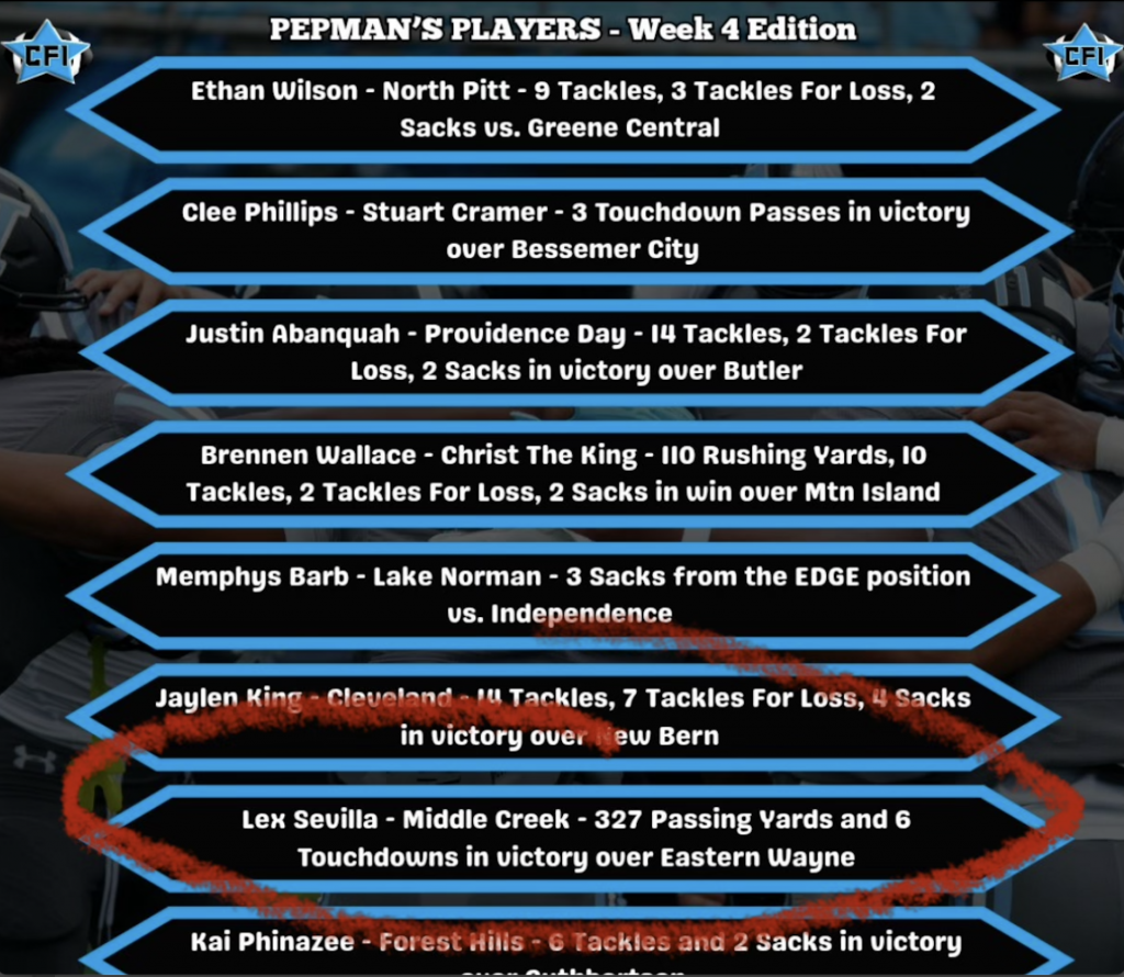 Lex Sevilla began playing the sport of football at the age of six in North Carolina. As a dual-threat athlete, he stood out exceling at both passing and running the ball early on in his football career. Academically, Lex has consistently stood out for his academic prowess, which is his top priority. He currently maintains a 4.375 GPA while taking Honors and AP courses at Middle Creek High School. Outside the classroom, he volunteers with the middle school group at his church. His aspirations are to earn an engineering degree and compete at the highest level of college football.