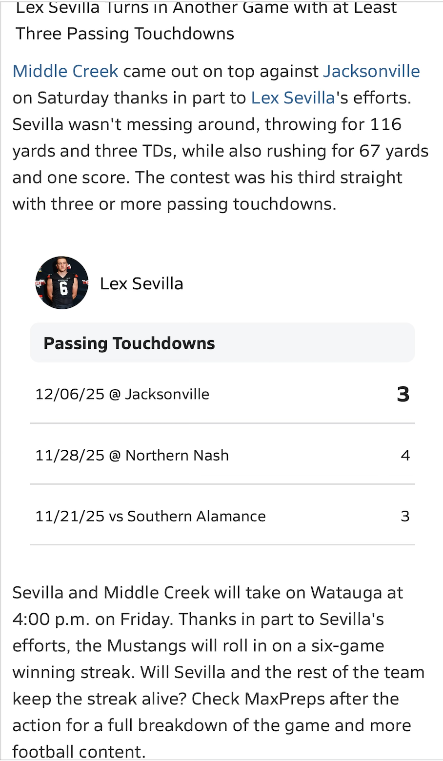 Sevilla turned in multiple standout performances, including games with three or more passing touchdowns and a multi-touchdown outing in playoff competition. Against Jacksonville, he threw for 116 yards and three scores, helping propel the Mustangs to a playoff win. In other matchups, he eclipsed 300+ passing yards and multiple TDs, illustrating his capacity to take over games and keep the offense humming through the stretch run. Sevilla’s leadership, consistent production, and rising recruitment visibility have drawn praise from local media and evaluators alike, establishing him as one of the region’s premier signal-callers heading into the next phase of his football journey.