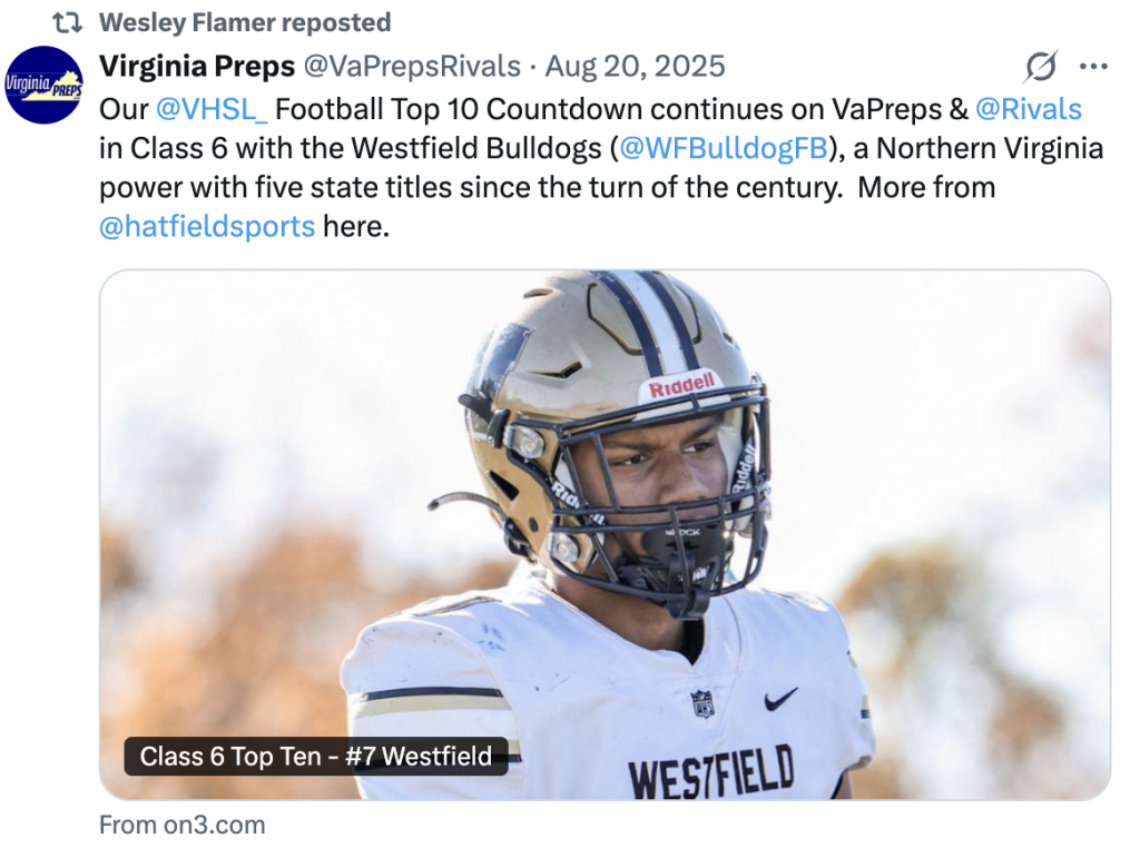 Wesley Flamer started playing tackle football at just five years old in East Shore, Maryland, for a team called the Shore Hawks. After that season, he briefly played flag football at age six, but quickly realized it wasn’t for him. Finding it too slow, he told his mom he wanted to return to tackle football. When his family moved back to Virginia, he began playing for Arlington County. In his first year, he played in the “Ankle Biters” division and quickly gained a reputation as aggressive, tough, and hardworking. That season, he played offensive line. The following year, he stayed with the same team but was finally able to run the ball, transitioning to running back.